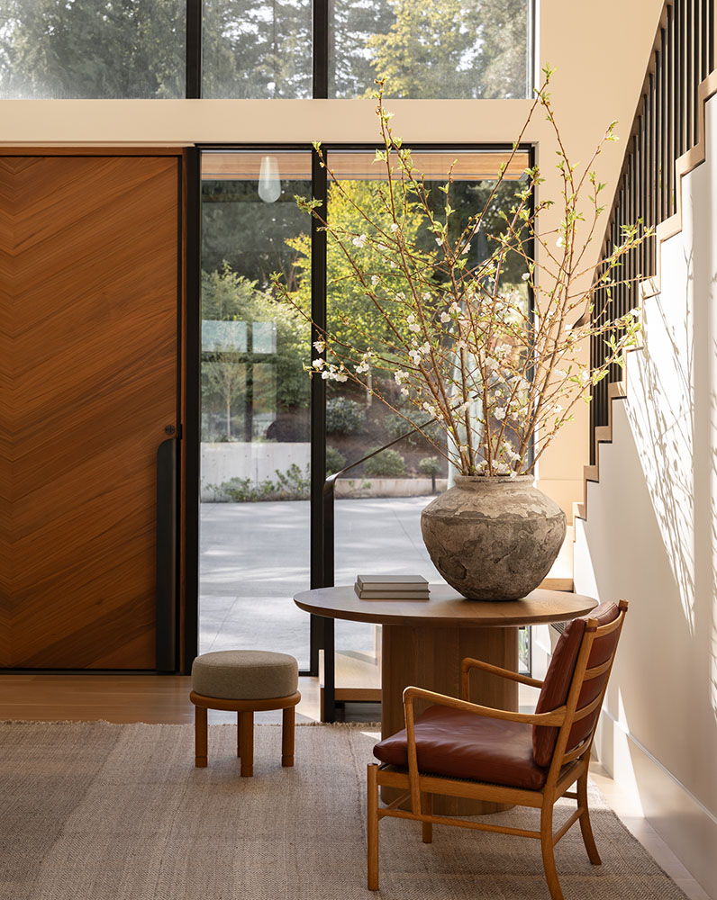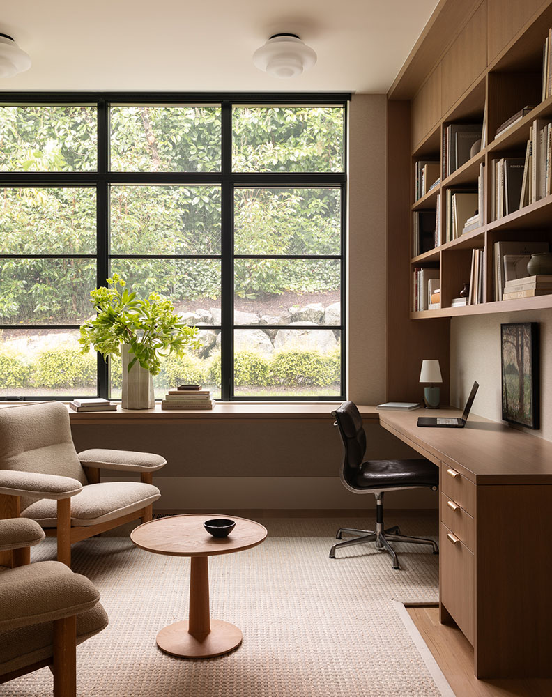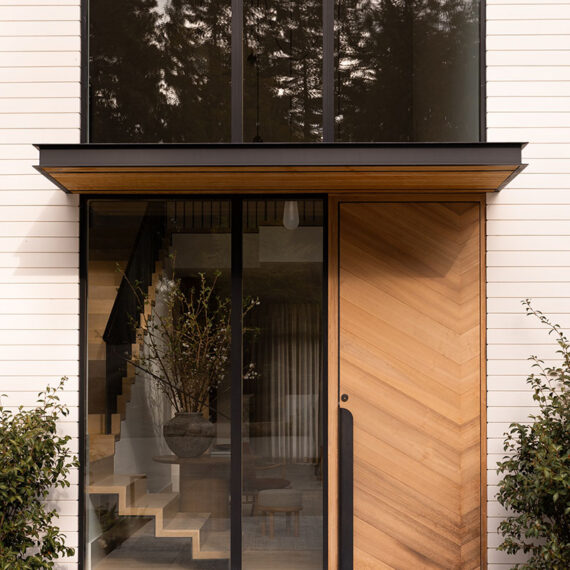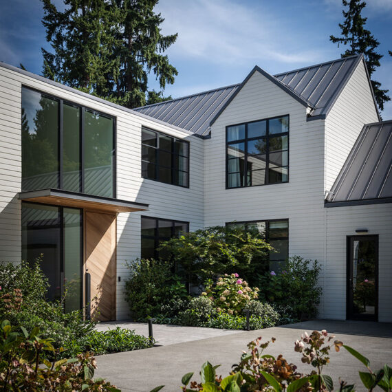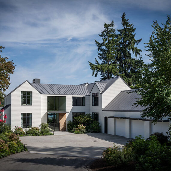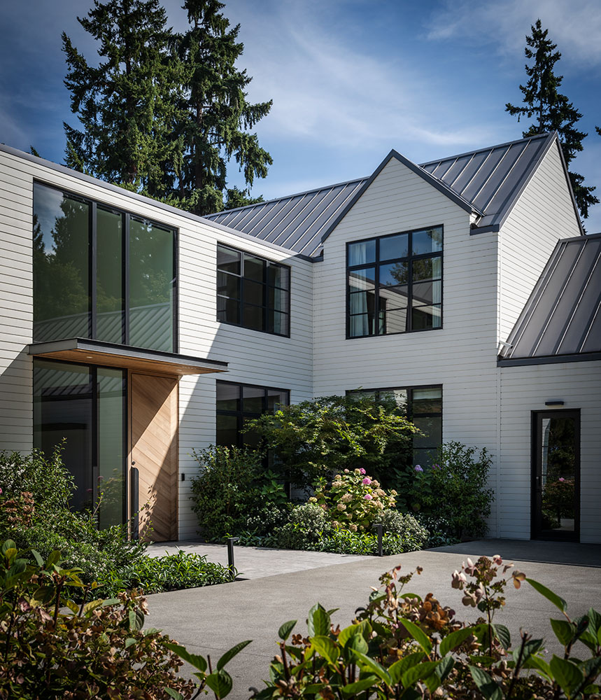 Architecturally, the home features gable roofs, clean lines, and contemporary interpretations of traditional forms. Expansive windows, designed with a steel-like aesthetic, frame views and flood the interiors with natural light, enhancing the bright, airy character of the spaces. Walls and trim are kept light to maximize the Pacific Northwest sunshine, even during winter months, while warm wood tones in cabinetry and trim provide a tactile balance to the white interiors.