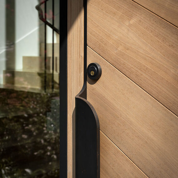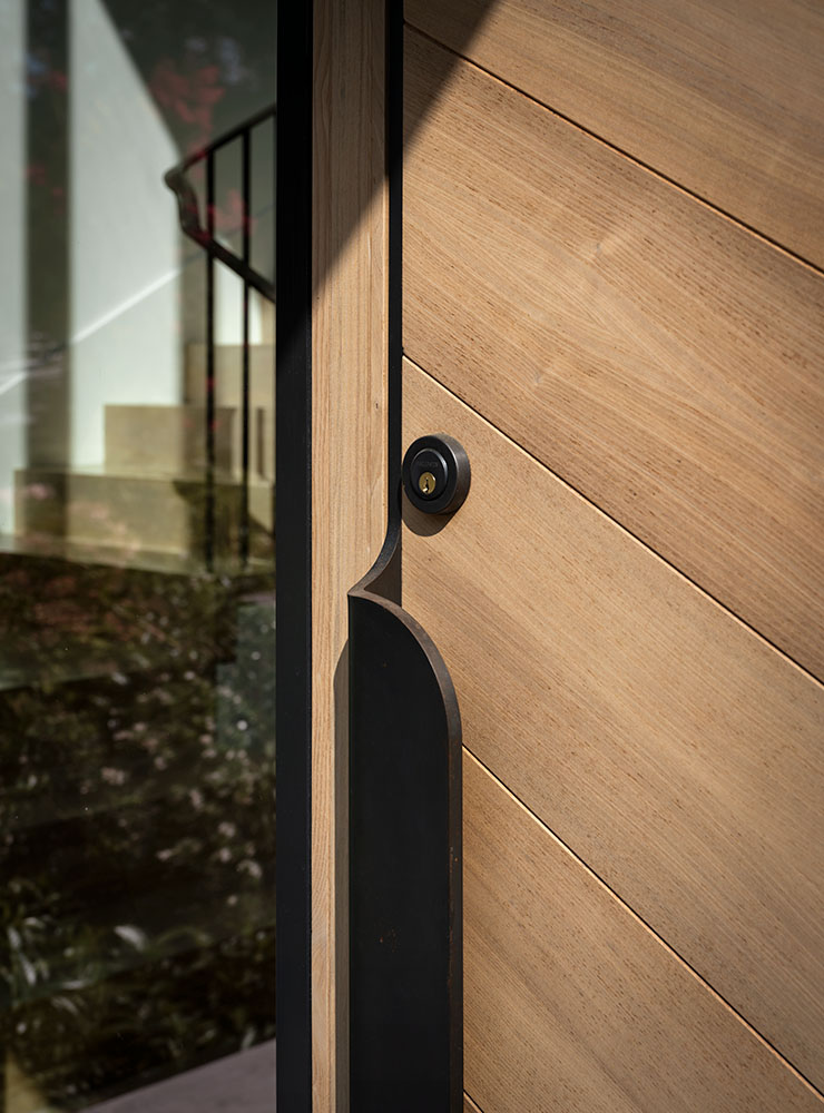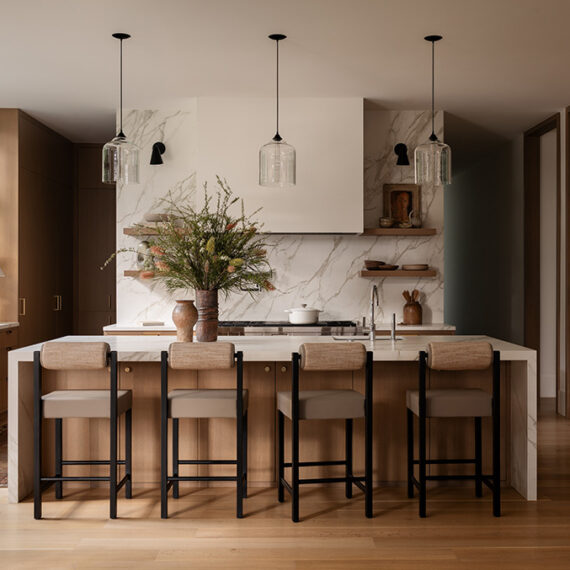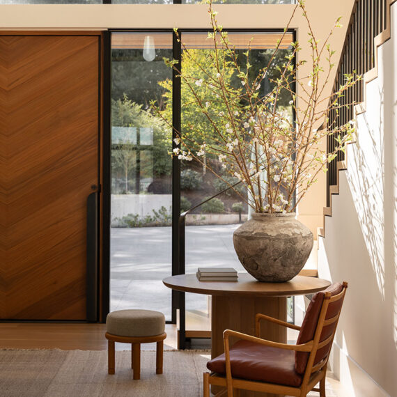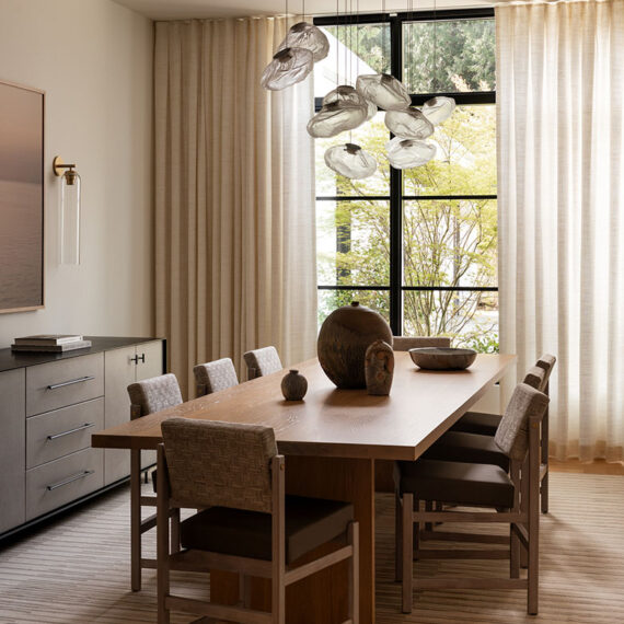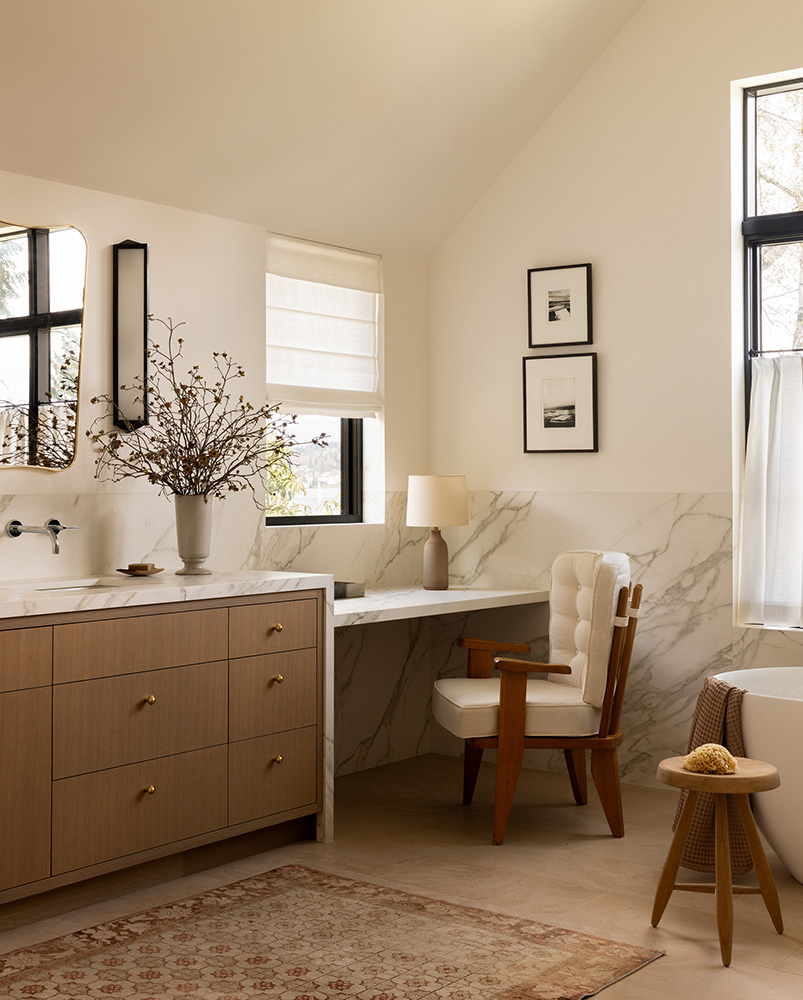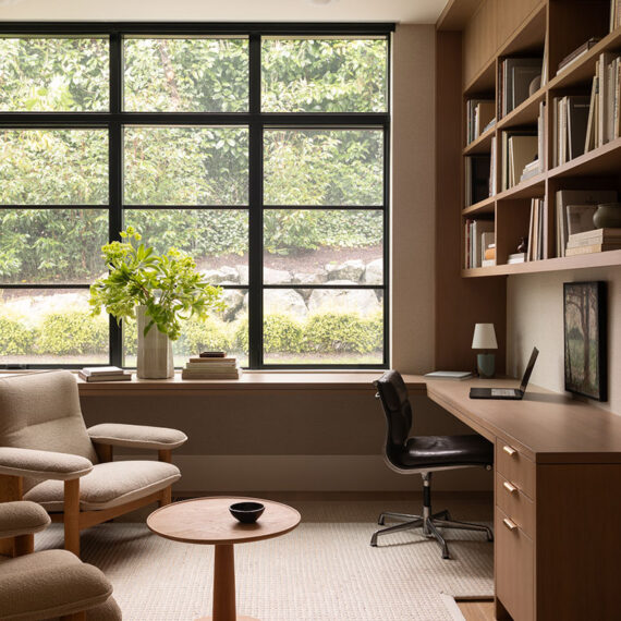 Architecturally, the home features gable roofs, clean lines, and contemporary interpretations of traditional forms. Expansive windows, designed with a steel-like aesthetic, frame views and flood the interiors with natural light, enhancing the bright, airy character of the spaces. Walls and trim are kept light to maximize the Pacific Northwest sunshine, even during winter months, while warm wood tones in cabinetry and trim provide a tactile balance to the white interiors.